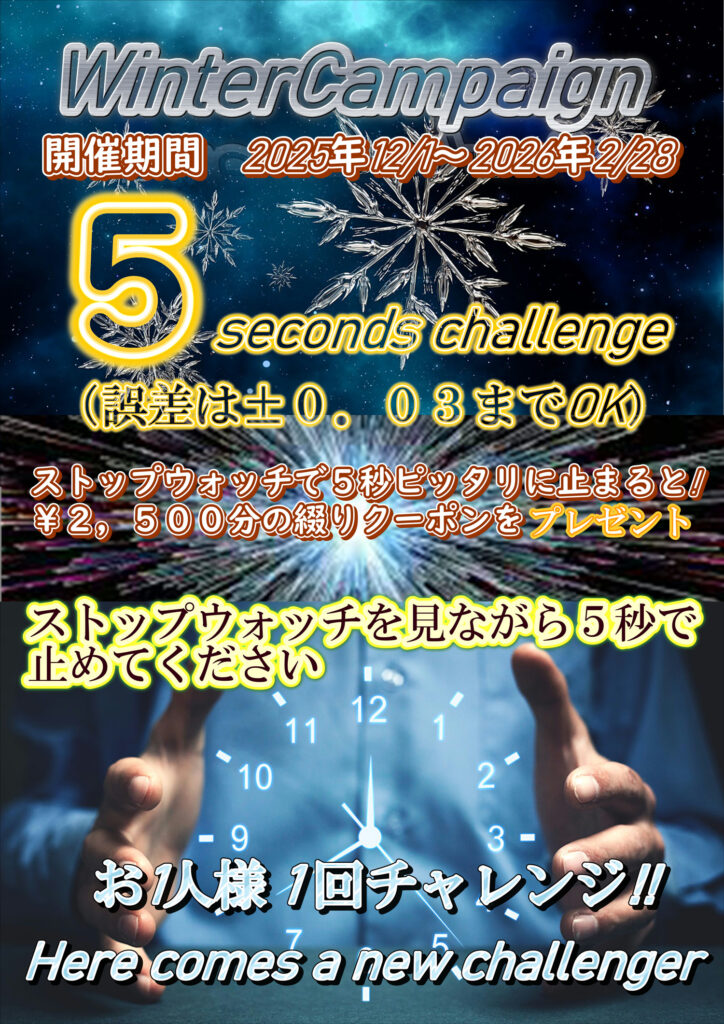 内容:ストップウォッチで、見事5秒に止められれば、2500円分の綴りクーポンプレゼント